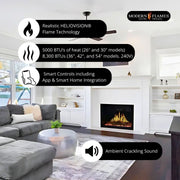The Modern Flames Orion Traditional Electric Fireplace is a built-in electric fireplace engineered to replicate the depth, motion, and character of a real fire without venting or combustion. Designed for installation into new or existing fireplace openings, this model uses HELIOVISIONβ’ Flame Technology to display multi-dimensional flames derived from virtual flame footage rather than mechanical lighting effects. Multiple flame styles, adjustable colors, and synchronized ember bed lighting allow precise visual customization. Select models provide higher heat output when hardwired, while app-based controls, sound effects, and thermostat regulation support daily use. The Modern Flames Orion Traditional Electric Fireplace is specified for renovations where realism, control, and simplified installation are required.